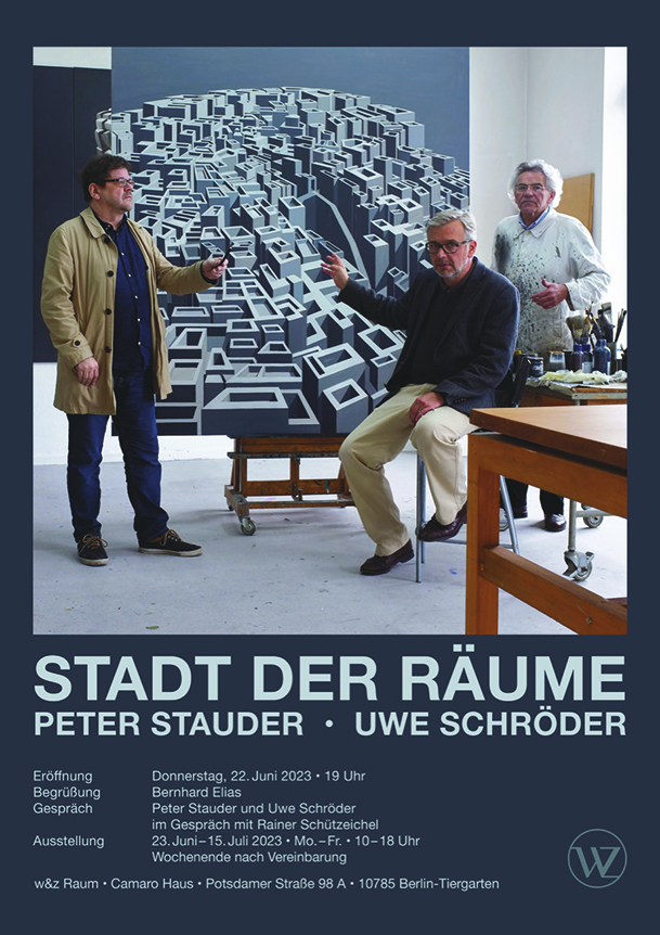 Eröffnung: Donnerstag, 22. Juni 2023 • 19 Uhr, Begrüßung: Gervin Zohlen, Bernhard Elias, Gespräch: Peter Stauder und Uwe Schröder im Gespräch mit Rainer Schützeichel, Ausstellung: 23. Juni – 15. Juli 2023 • Mo. – Fr. • 10 – 18 Uhr Wochenende nach Vereinbarung, w&z Raum • Camaro Haus • Potsdamer Straße 98 A • 10785 Berlin-Tiergarten