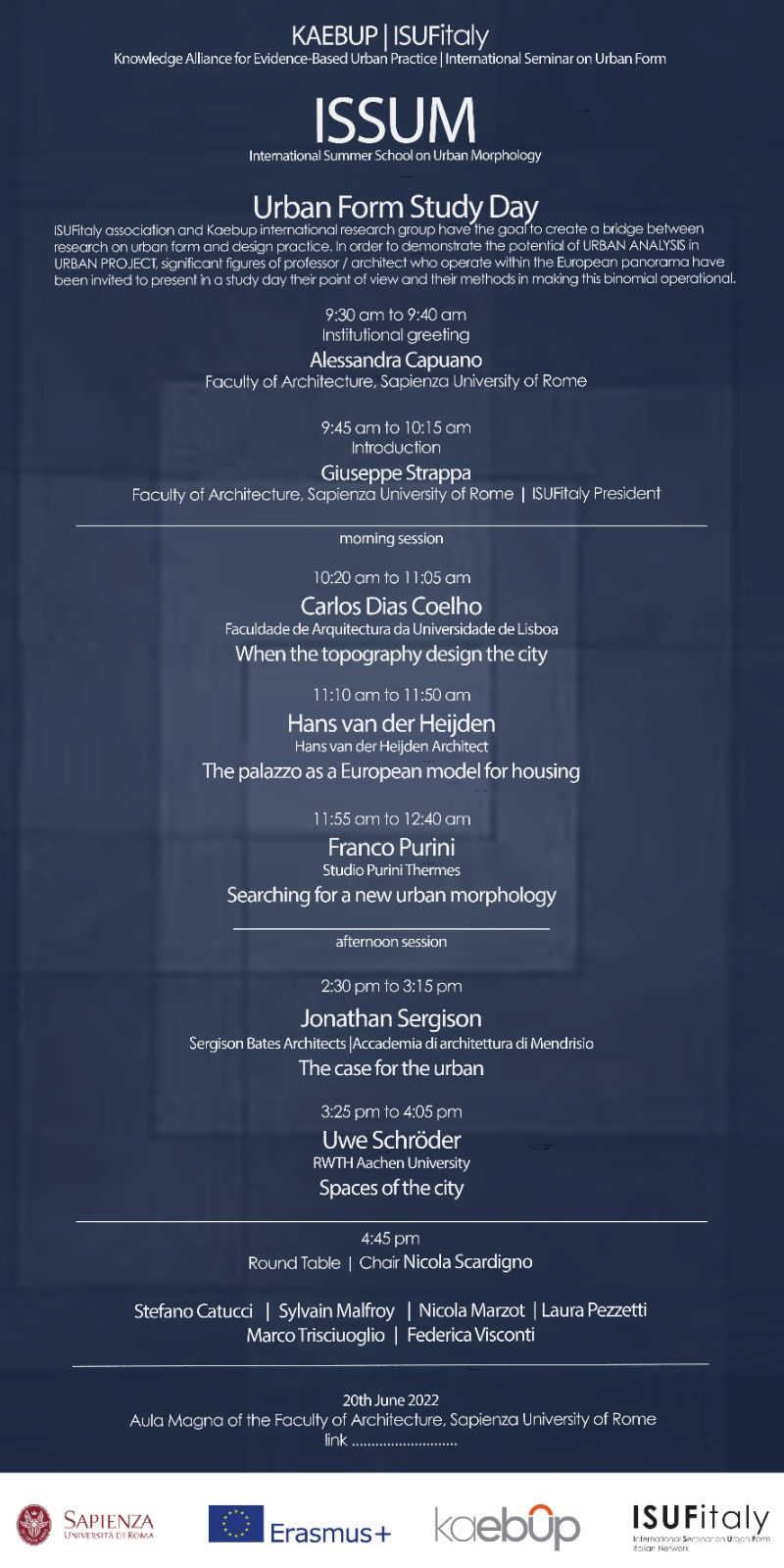 ISUFitaly association and Kaebup international research group have the goal to create a bridge between research on urban form and design practice. In order to demonstrate the potential of URBAN ANALYSIS in URBAN PRO IECI. sarificant figures of crofessor / architect wno operate within the European panorama have been invired to present in a study day their point ot view and their methods in making this binomial operational.