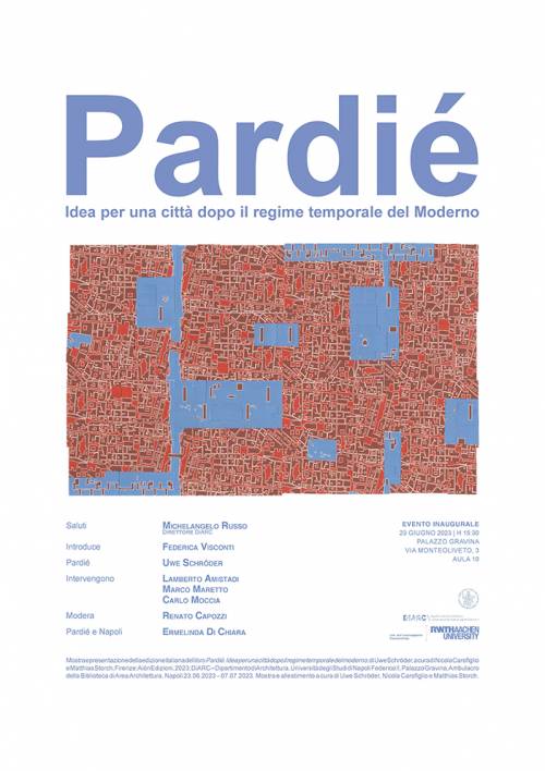 In occasione della presentazione del libro Pardié. Idea per una città dopo il regime temporale del moderno, di Uwe Schröder, a cura di Nicola Carofiglio e Matthias Storch, Firenze: Aión Edizioni, 2023; presso il dipartimento DiARC – Dipartimento di Architettura, Università degli Studi di Napoli Federico II a Palazzo Gravina, Napoli 23.06.2023 - 07.07.2023. Mostra e allestimento a cura di Uwe Schröder, Nicola Carofiglio e Matthias Storch.