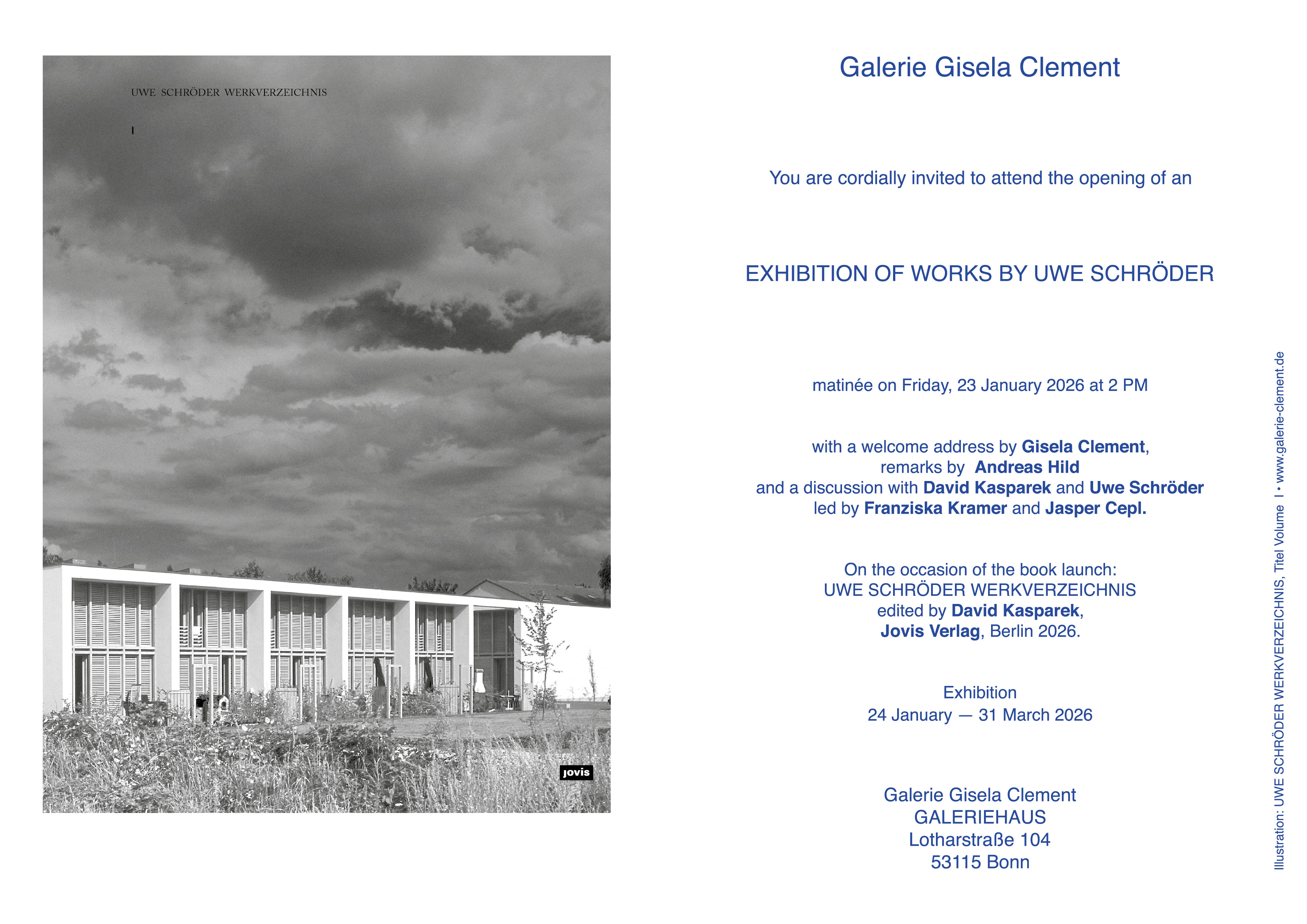 Die Ausstellung in der Galerie lädt die Besucher ein, sich voll und ganz in den „Kosmos Architektur“ des in Bonn arbeitenden und in Aachen lehrenden Architekten und Professors Uwe Schröder zu vertiefen. Von Anfang an ist die praktische Arbeit Schröders als Architekt von Theoriebildung geprägt. Die beiden Säulen Theorie und Praxis werden ab dem Jahr 2000 durch eine dritte ergänzt: die Lehre. In einer steten Wechselwirkung beeinflussen sich diese drei Ebenen im Laufe der Zeit und führen zu einem sich ständig vertiefenden Verständnis architektonischer Grundgegebenheiten. Mit seiner klaren Haltung prägt Schröder so seit mehr als drei Jahrzehnten die Debatte zu grundlegenden Themen der Architektur: Topologie und Typologie, Raum und Ästhetik. Die Schau in der Galerie bildet das ab und trägt veröffentlichte Bücher, Fotografien gebauter Architekturen, Abbildungen projektierter Entwürfe, Collagen und Modelle zusammen. Utopisches und Konkretes, Theoretisches und Praktisches amalgamiert die Ausstellung zu einem Großen und Ganzen. Dabei wird der Ausstellungsort selbst zum begehbaren Ausstellungsobjekt, einem Raum für Räume – ist das Galeriehaus doch bis 2014 nach Plänen des Architekten realisiert worden. So ergibt sich ein faszinierendes Bild der wechselseitigen Beeinflussungen der sonst so oft voneinander getrennten Disziplinen Bauen, Denken und Lehren. Zur Ausstellung werden die beiden im Berliner Jovis Verlag veröffentlichten Neuerscheinungen „Uwe Schröder Werkverzeichnis I“ und „II“ vorgestellt. Ausstellung und Bücher sind dabei nicht als Abschluss, sondern als Zwischenbilanz eines bis hierher entstandenen Werkes zu betrachten, dessen Entwicklung als ein stetes Kreisen um den architektonischen Raum als Spirale eines fortwährenden Weiterkommens zu lesen ist. David Kasparek