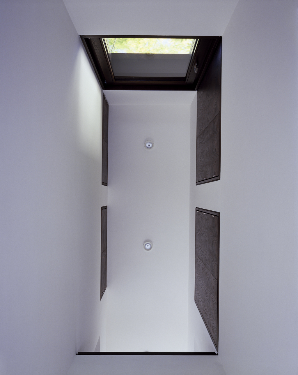 Im Haus Hundertacht findet der Raum in seiner aus der Stadt heraus motivierten Stufenfolge von Platz zu Zelle eine ideelle Ordnung. In der Umgebung des Hauses haben die Wohnbauten, freistehend oder gereiht, straßenbegleitend Aufstellung gefunden. Durch die Hanglage erfahren die Häuserreihen eine dem Gelände folgende Terrassierung. Mit der achsialen Bezugnahme des Entwurfs auf das höher am Hang gelegene Haus Clement, wodurch das Haus Hundertacht um ein Weniges von der Straßenflucht abweicht, wird dieser Struktur eine zweite Ordnung überlagert. Die Geschwisterhäuser beziehen sich als Ensemble aufeinander. Ein mit Klinker belegter Vorplatz markiert den Übergang vom öffentlichen Raum der Straße zum Raum des familiären Wohnens. Vom Vorplatz führt eine in der Mittelachse des Hauses verlaufende Passage über einige Stufen in den zentralen Wohnraum des Hauses, der sich über die gesamte Gebäudebreite erstreckt und an beiden Seiten von Terrassen erweitert wird. In den beiden Obergeschossen des nach Südwesten hin abgetreppten Hauses sind die Schlafräume untergebracht. Doch führt die Treppe weiter nach oben: zu einem studiolo, das dem Aufenthalt und der Arbeit einer einzelnen Person vorbehalten ist. Dieser Raum des Einzelnen, am Ende des Weges gelegen, ist zugleich der kleinste Baustein der Stadt. Das Bild der Stadt im Haus erscheint im Haus Hundertacht zum einen mithilfe der durchgängigen Materialität des Klinkers, der sich vom Ausschnitt des Stadtbodens am Vorplatz über den inneren Verkehrsweg im Erdgeschoss und den zentralen Wohnraum bis zu den Gartenterrassen zieht. Zum anderen erscheint es in der Variation des ‚städtischen Platzes’ und in der Raumhierarchie. Dies führt zur intensiveren Kenntnisnahme des Motivs: Das Bild des öffentlichen Platzes erscheint im Wohnraum des Hauses, dem sich die umfassenden Wände wie Straßenfassaden umliegender Häuser zuwenden, und der Weg innerhalb des Hauses führt von der Gemeinschaft zum Einzelnen – und umgekehrt.