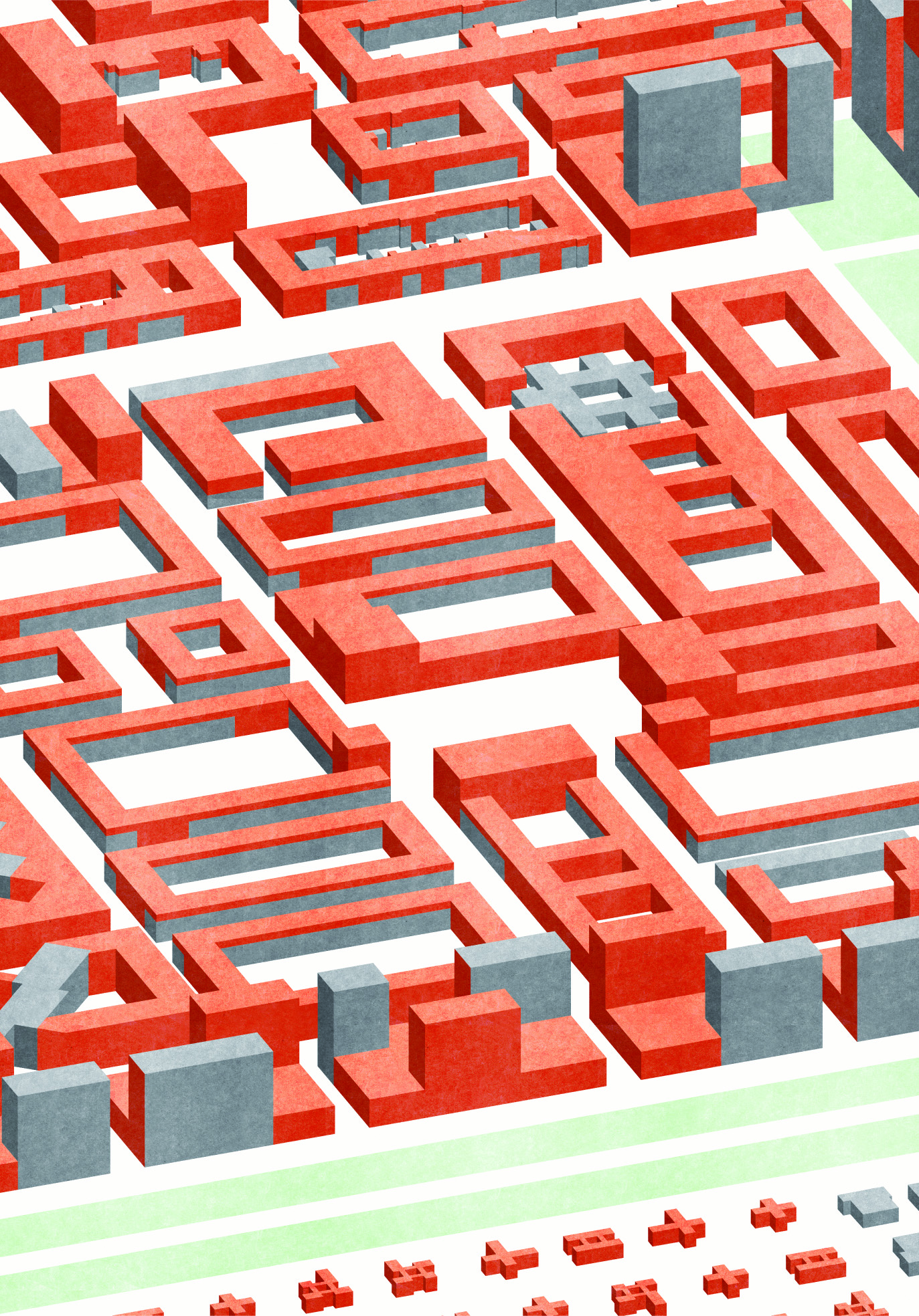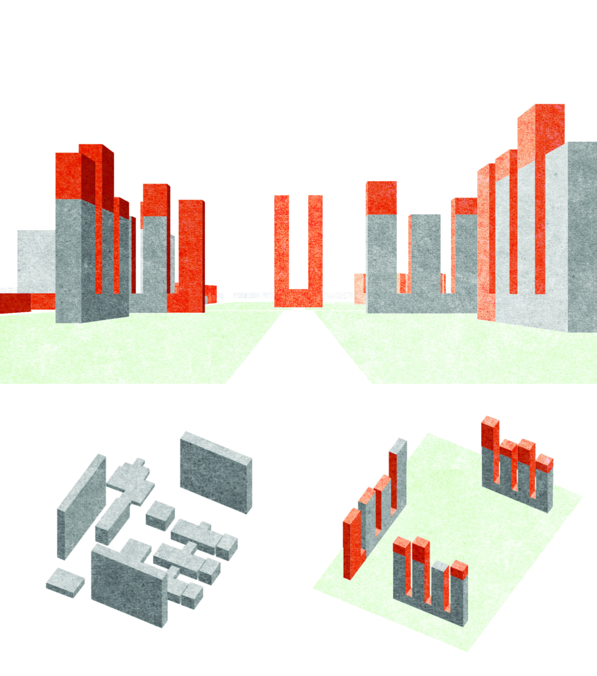 To clarify how these intervention zones might be transformed and what this means in terms of urban morphology, we introduced a set of abstract illustrations, which show the transformation from the existing objects to the new spatial objects and the resulting perspectival view this generates.