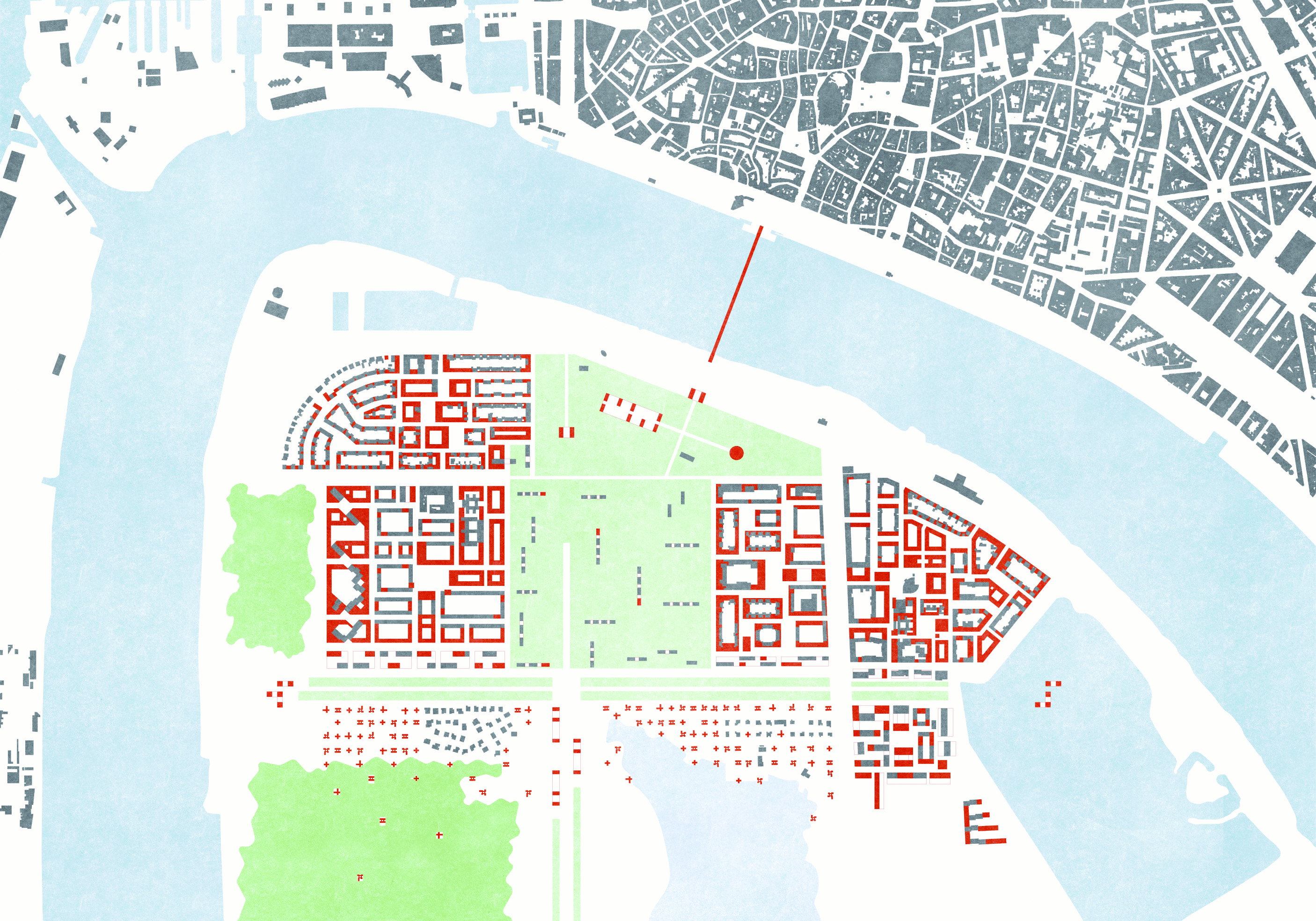 In this ideography the existing elements are indicated in grey and the red elements should be read as indicating the zones for spatial intervention. As one can imagine these spatial intervention zones are also the zones harbouring the potential for further densification on the Linkeroever. However one will also have to understand that these interventions will be strongly dependent on opportunities, so as such the ideography again does not represent an urban plan, but a spatial strategy in time.