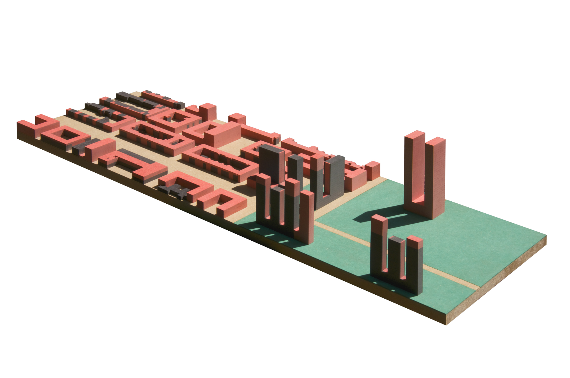 The plan illustrating our idea should be read as an ideography, as a spatial scenario and not as an urban plan. In this ideography we interpreted the Linkeroever as a general spatial condition we generally find in the periphery of the contemporary European City, and as such we try to show how in such circumstances some spatial order and urban form might be created by making a clear distinction between two spatial identities: 'space defined by objects, or space within volumes' and 'space surrounding objects, or space between volumes'.