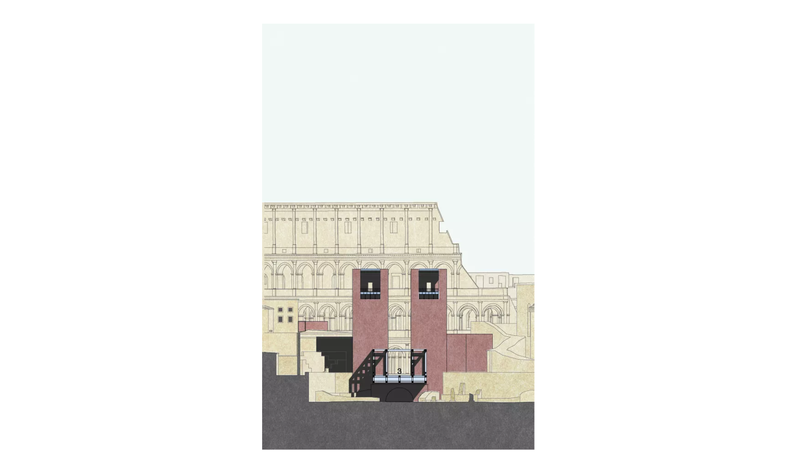 An der Maxentiusbasilika mündet die Ponte dei Fori zwischen den beiden Türmen des Brückenkopfes in eine gestreckte Platzanlage vor dem Kolosseum ein, die auf beiden Längsseiten von tiefen Säulenhallen mit eingezogenen Galerien eingefasst wird. An diesem Vorplatz zu den archäologischen Feldern der Foren sind hier Eingangssituation und Besucherzentrum, Café, Bookshop, Bus- und Taxihaltestellen und der Eingang zum Antiquarium angelegt.