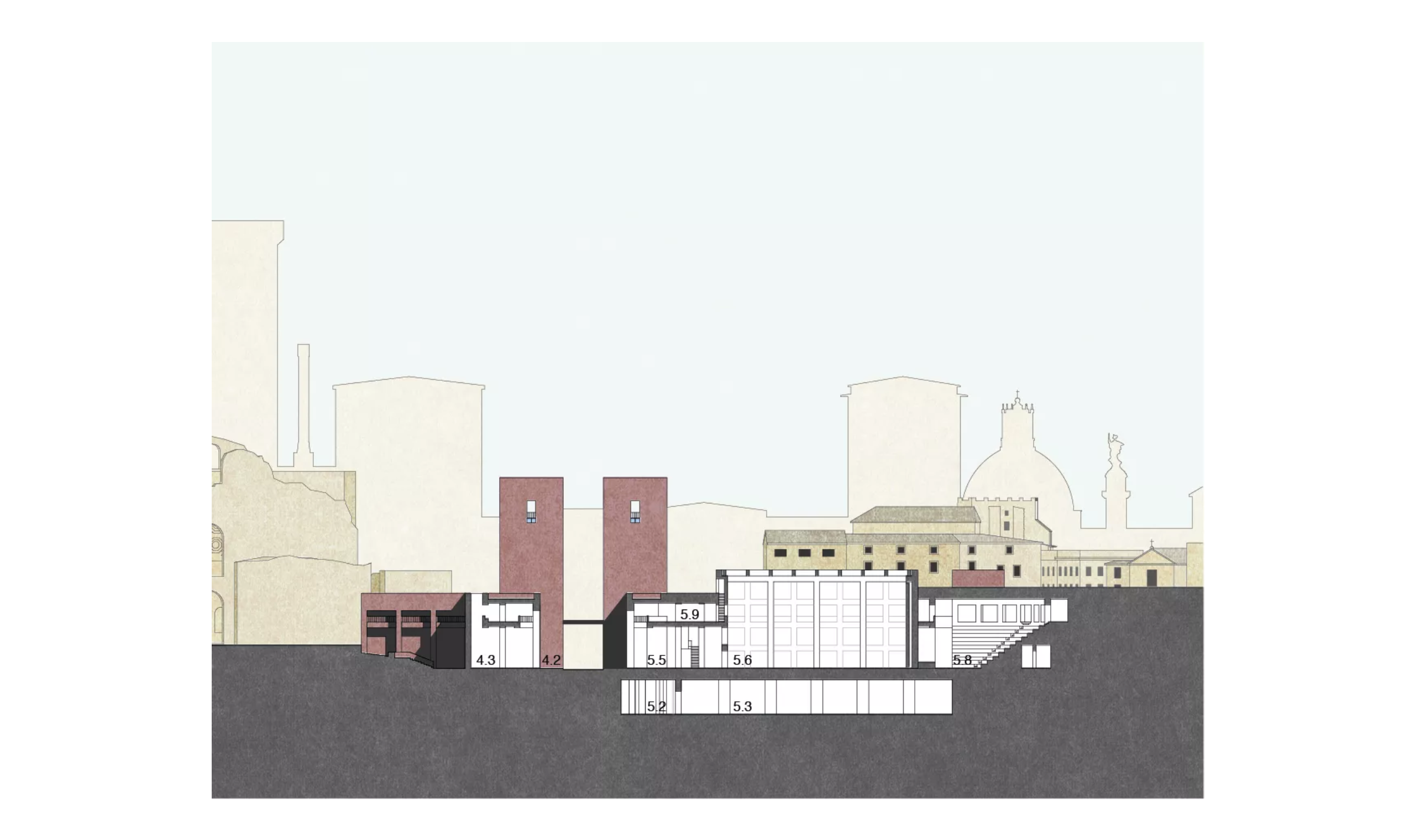 Die tiefliegende Ausgrabungsstätte an der Piazza Venezia, das Auditorium des Hadrians, die über einen unterirdischen, orthogonal verlaufenden Korridor an die archäologische Ebene angeschlossen ist, wird von stützenfreien Wandträgern abgedeckt, die das Licht über ein zentrales Oberlicht einführen. Auf dem Platz erscheint das Bauwerk als monumentale Brunnenanlage.