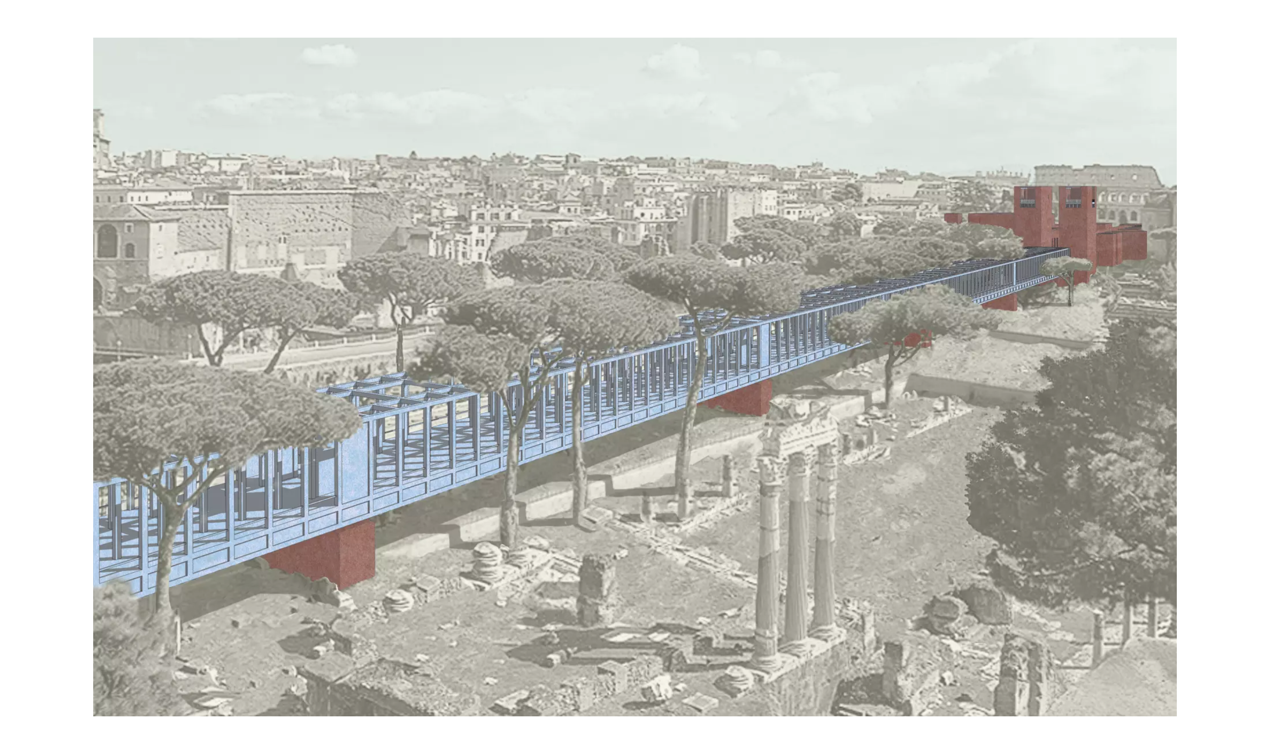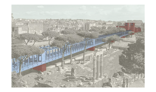 Auf einer Länge von 418,05 Metern überspannt die himmelblaue Stahlbrücke an der Stelle der Via dei fori das archäologische Feld der Kaiserforen. Alle 82,8 Meter ist die filigrane Konstruktion auf gemauerten Pfeilern, die sich respektvoll in die archäologische Anlage einfügen, aufgelagert. An der Stelle der ehemals aufgeschütteten Straße wird der stadträumliche und bauliche Zusammenhang zwischen den Kaiserforen und dem Forum Romanum von und unter der Brücke wieder erlebbar.