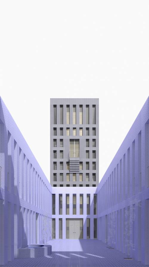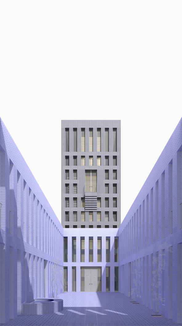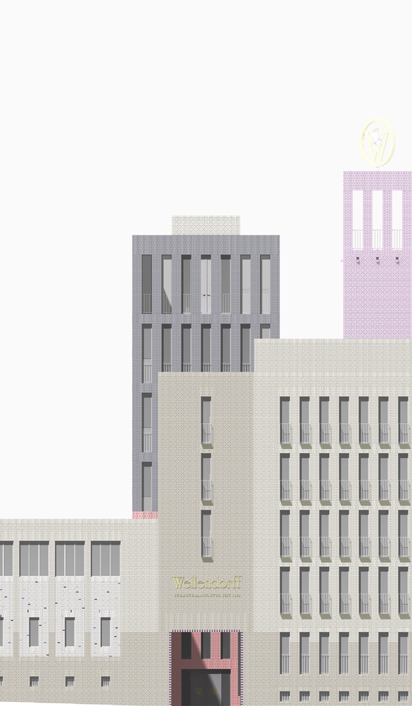 Der Firmensitz der Schmuckmanufaktur Wellendorf in Pforzheim stellt sich gegenwärtig als zusammengesetzter Block vor, dessen verschiedene Anlagen und Häuser mit Ausnahme des älteren nordwestlich gelegenen Gebäudeteils aus den ersten Dekaden der Nachkriegszeit stammen. Mit der inneren Anordnung des Turmes als neues Eingangsgebäude und dem Ausbau zu einer Doppelhofanlage wandelt der Entwurf den heterogenen Block entschieden zum Hof mit zentraler innerer Erschließung. Die aufgehenden Mauerwerke der beiden Höfe sind in der Flucht des Turmes im Inneren eingestellt und axial aufeinander bezogen. Inmitten der geometrisch regelhaften neuen Hofwände und der inneren unregelmäßigen baulichen Kontur der bestehenden Gebäudeteile bildet sich eine umlaufende Wandelhalle heraus, welche die horizontale Erschließung und unmittelbare Erreichbarkeit der unterschiedlichen Nutzungsbereiche im Gebäudeensemble sicherstellt. In der Mitte der Hofanlage übernimmt der Turm zwischen dem östlichen und dem westlichen Hof die vertikale Erschließung der verschieden Ebenen. Mit den proportional aufeinander bezogenen Raumkompartimenten von Tor, Passage, Schwelle, Hof, Schwelle und der zweigeschossigen Halle im Turm wird die östliche Eingangssituation vom Turnplatz ausgehend in einer großen Raumfolge neugestaltet. Über der Eingangshalle erheben sich die repräsentativen Bereiche und Zonen für Besucher und die Büroflächen der Betriebsleitung. Auf der obersten Ebene des Turms öffnet sich eine großzügige Terrasse, die die Rücksicht auf die Stadt gewährt. Der westliche Hof ist angehoben und überdeckt sein ursprüngliches Niveau, auf dem nach wie vor die Einstellplätze untergebracht sind. Während der östliche Hof das Herzstück der neuen Raumgestaltung des Entrees darstellt, lässt sich der westliche Hof, nunmehr von Verkehr und Anlieferung befreit, für allerlei Veranstaltungen und festliche Anlässe in Gebrauch nehmen. Über die umlaufende Wandelhalle sind beide Höfe an die unterschiedlichen Nutzungsbereiche der Manufaktur, des Museums, der Produktions- und Werkstattflächen und der Seminar, Besprechungs- und Verwaltungsbereiche angeschlossen.